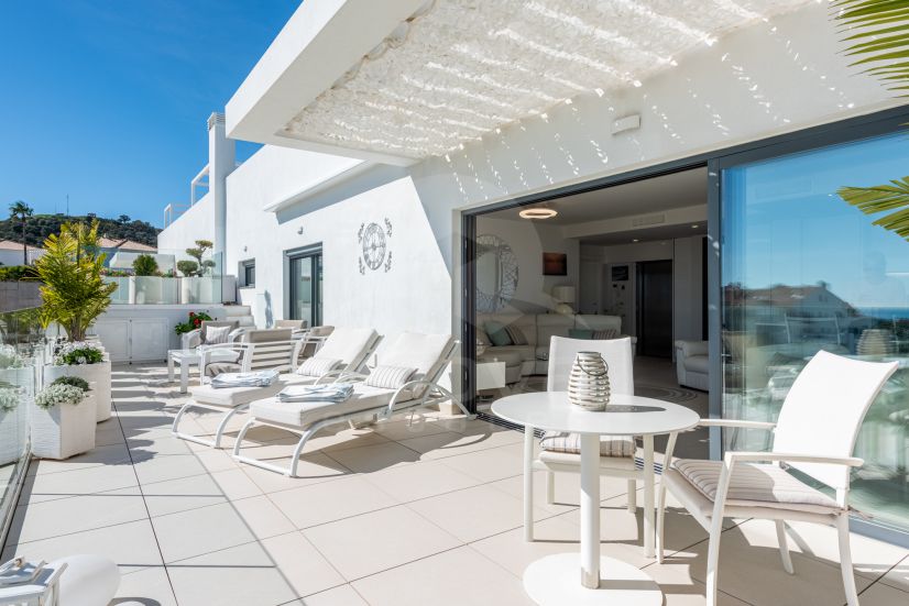 Toppleilighet til salgs i Mijas Costa med 2 Soverom, 2 Bad, 1 bad en suite, eiendommen ble bygget i 2022 og funksjoner et svømmebasseng (Privat), en garasje (Privat) og en hage (Felles). Når det gjelder eiendommens dimensjoner, har den 114 m² bygget, 86 m² interiør, 145 m² terrasse.
