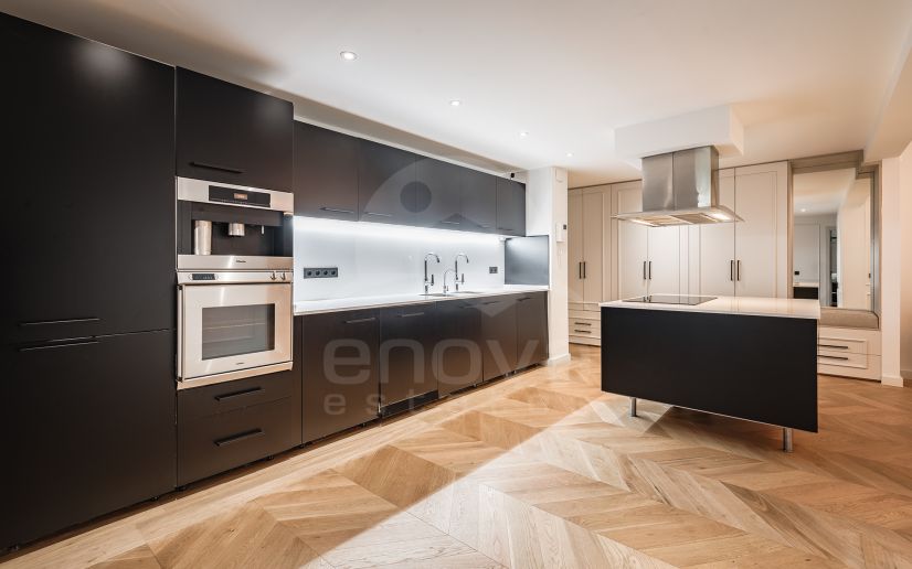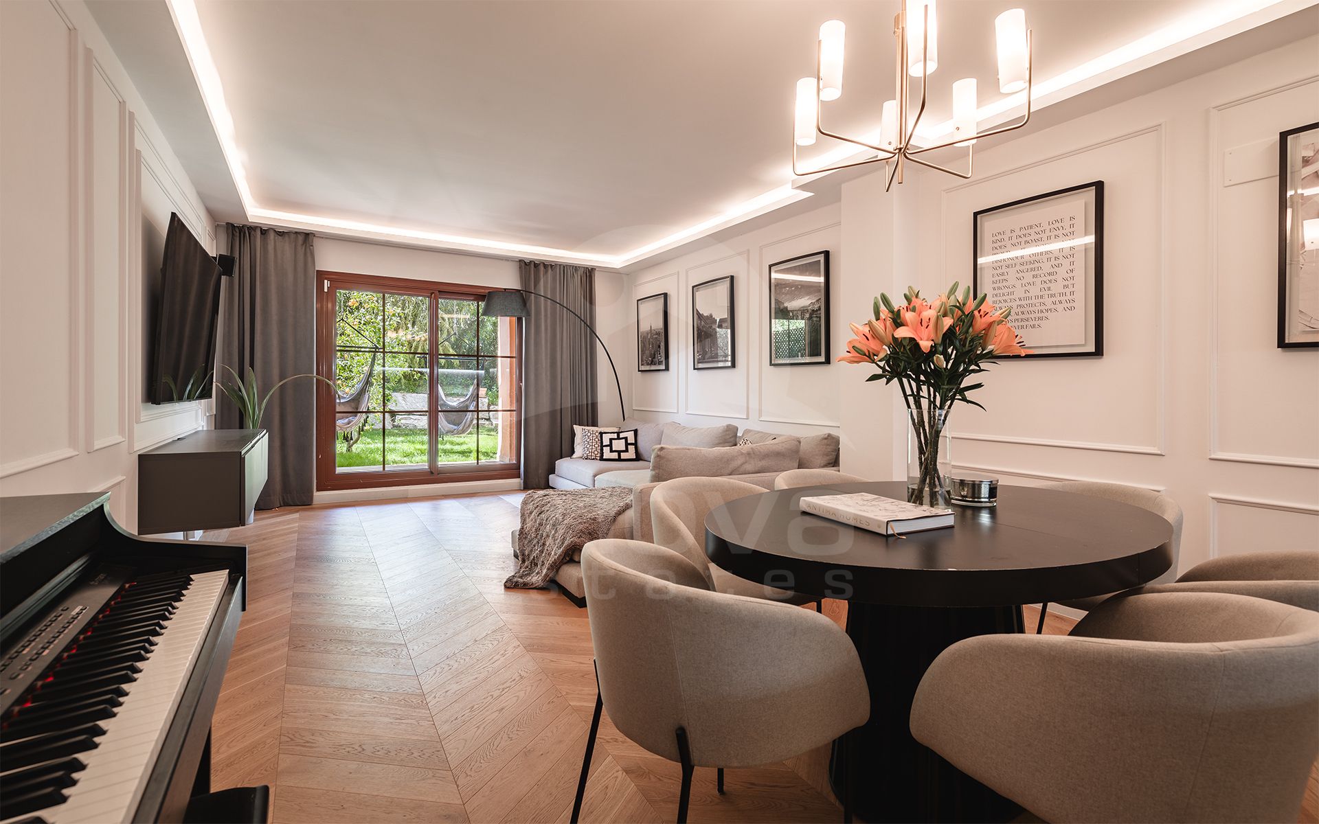 Zu den weiteren Merkmalen gehören: Eichenholzböden im Fischgrätmuster, Klimaanlage warm und kalt, Fußbodenheizung in den Bädern, Sono-Soundsystem im Wohnzimmer. Die Immobilie verfügt über eine Garage und einen Abstellraum im Untergeschoss.