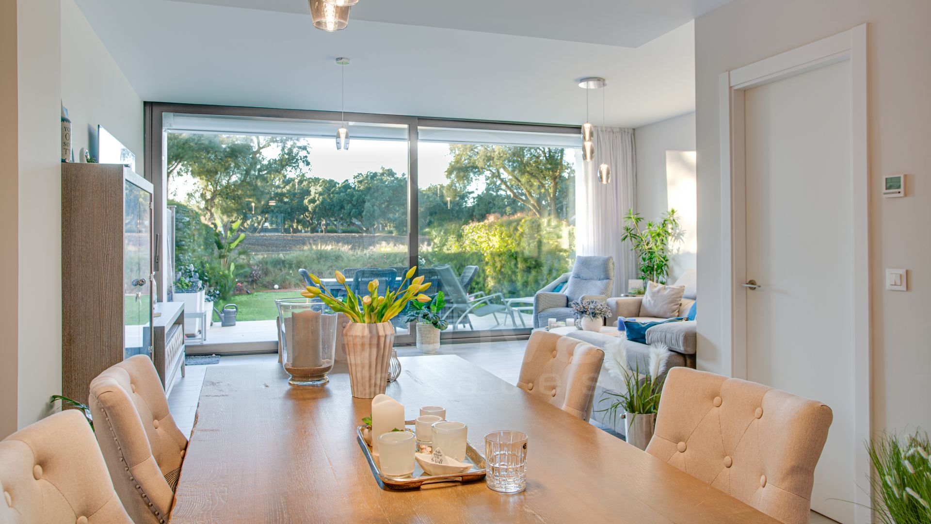 This modern townhouse in excellent condition combines contemporary architecture with a functional layout across three levels. The open-plan living area leads directly to a west-facing terrace and private garden, offering stunning views over the golf course. The fully equipped kitchen, designed in elegant grey and white tones, features branded appliances and an adjacent utility room. The upper floor includes three bedrooms, among them a master suite with en-suite bathroom and balcony. A separate studio with its own bathroom and a spacious rooftop terrace with far-reaching sea views complete the living space. The gated community offers a well-maintained communal pool, fitness area with sauna, and convenient access to numerous golf courses, beaches, and shopping facilities. Ideally suited for buyers seeking modern comforts, tranquillity, and proximity to leisure options.