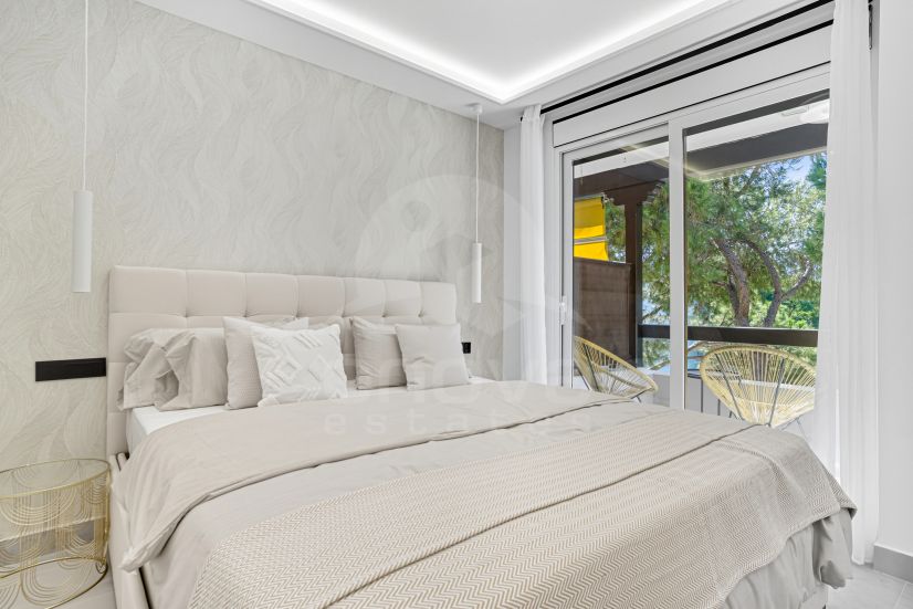 This exceptional three-bedroom apartment is situated in a highly sought-after location on Marbella’s prestigious Golden Mile, within the charming urbanization of La Carolina Park. The community offers extensive landscaped gardens, two swimming pools, and a tennis court, while also being within easy walking distance to the beach, renowned restaurants, and all essential amenities. Recently renovated to a high standard, the apartment is west-facing and features a spacious open-plan kitchen and living area with modern fittings and air conditioning, seamlessly connecting to a private terrace perfect for outdoor dining or enjoying the afternoon sun. The master bedroom boasts an en-suite bathroom, complemented by two additional well-sized bedrooms and a second bathroom. In addition, the property includes a parking space for one car in the communal garage, making it perfectly suited for comfortable year-round living in one of Marbella’s most desirable areas.
