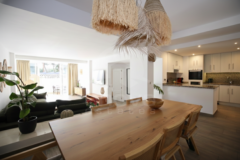 Beautiful south-facing, two-bedroom apartment located within the quiet and secure gated beachfront community of Jardines de las Golondrinas, Elviria. Ideally positioned next to the prestigious Don Carlos Hotel and Nikki Beach, this prime location offers direct access to one of Marbella’s finest beach areas. The property is just a short walk from the beach and close to local shops, restaurants, and everyday amenities. The apartment offers a comfortable and practical layout with two spacious bedrooms, two modern bathrooms, and a bright living and dining area connected to an open-plan kitchen. The living space opens onto a large private terrace, ideal for relaxing and enjoying the outdoor lifestyle. Residents enjoy access to beautifully maintained landscaped gardens, communal swimming pools, and an on-site pool restaurant, creating a peaceful yet vibrant beachfront environment.