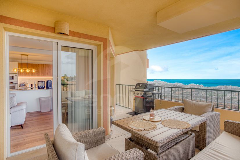 Impecable apartamento de dos dormitorios con orientación sur, situado en la comunidad cerrada de Terrazas del Sol, un complejo muy bien mantenido en la parte superior de Riviera del Sol. Los residentes disfrutan del acceso a una gran piscina comunitaria y exuberantes jardines ajardinados. A solo media hora en coche del aeropuerto de Málaga, con una parada de autobús cerca más la propiedad está también cerca de pistas de tenis, campos de golf, restaurantes y tiendas. La propiedad está totalmente reformada y diseñada para vivir moderna con un luminoso salón y cocina de planta abierta; dormitorio principal; baño de invitados; y una terraza privada con impresionantes vistas panorámicas al mar; perfecto para relajarse y ver el atardecer. Otras características incluyen una nueva unidad AC, plaza de aparcamiento privado y lavadero seperte.