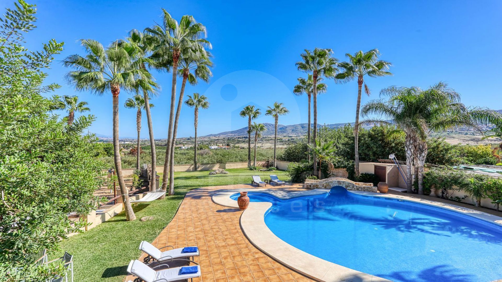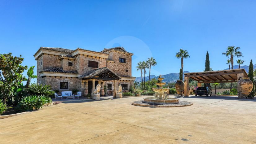 La propiedad cuenta con amplios espacios rodeados de palmeras y un jardín maduro, donde destaca una hermosa fuente central. El acceso para vehículos es amplio, facilitando la llegada a esta joya. En la planta baja, se encuentra un vestíbulo de entrada y un aseo para invitados, además de una cocina con lavadero independiente y un gran salón con chimenea, ideal para disfrutar de momentos acogedores.
